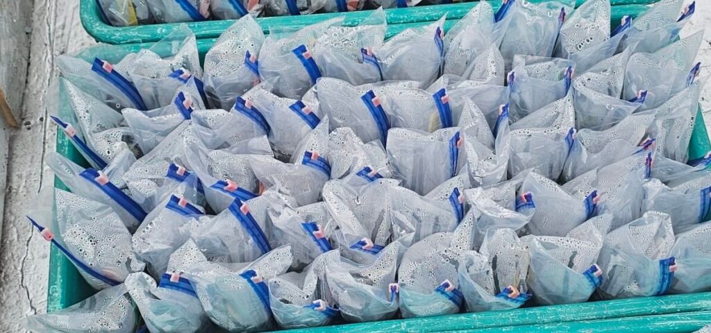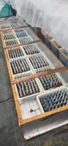 When considered large enough, seedlings are removed from their poly-bags and allowed to grow on. They are then pricked out into 30mm plug trays.